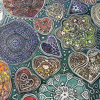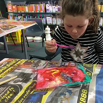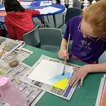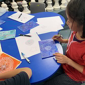 Art elective for fun and expression with playful painted backgrounds. Experimenting with bubble paint effect, colour blending, and using baking soda and vinegar. Manadala style drawings overtop using white paint pens and outlines in black. Installed as a collaborative art piece.