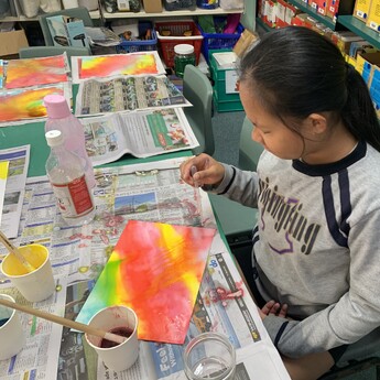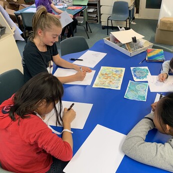 Art elective for fun and expression with playful painted backgrounds. Experimenting with bubble paint effect, colour blending, and using baking soda and vinegar. Manadala style drawings overtop using white paint pens and outlines in black. Installed as a collaborative art piece.